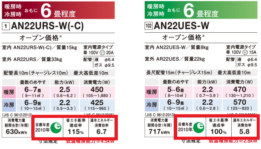 - APF:一定条件での電力1kWあたりの冷暖房能力。数値が大きいほど省エネ。